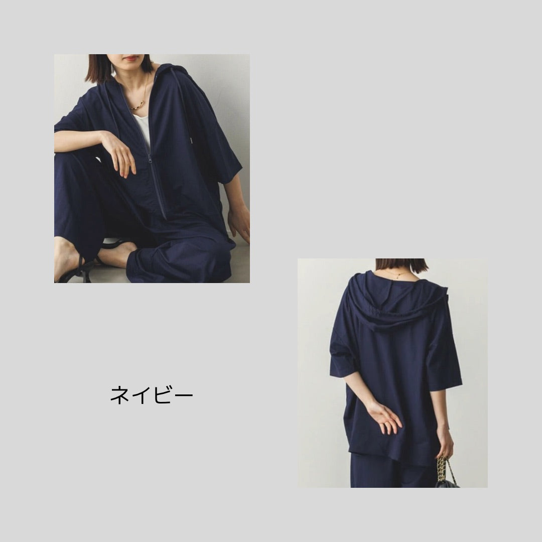 さらさらシリーズのバイカラープルオーバーなど自体が、去年から出てたほうの水玉カットソーとも似てるので、ということは『あの水玉カットソーと同じ素材のフードパーカー仕様♪』とほぼ同じ感じということです。