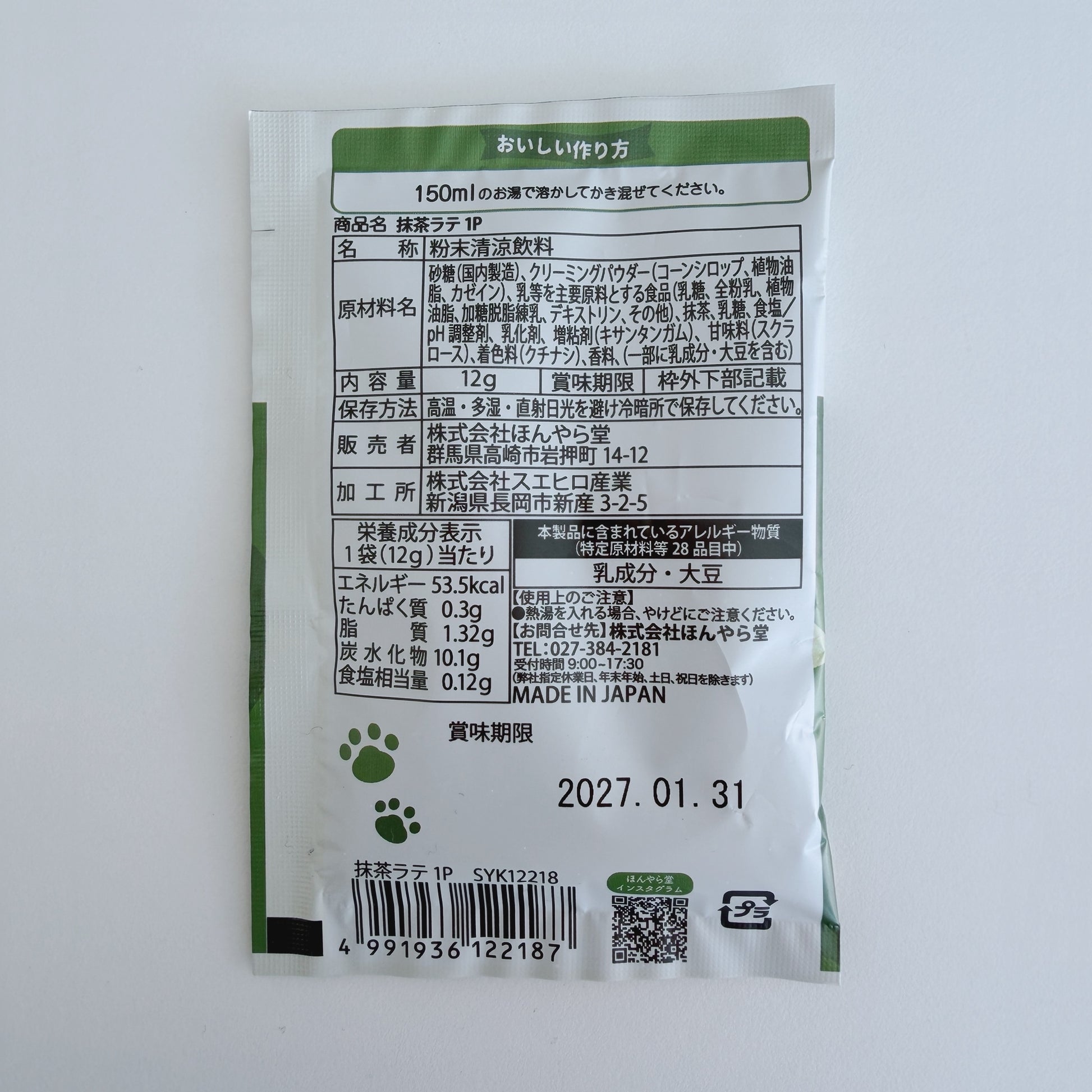 抹茶ラテ:たんぱく質0.3g、脂質1.32g、炭水化物10.1g、食塩相当量0.12g