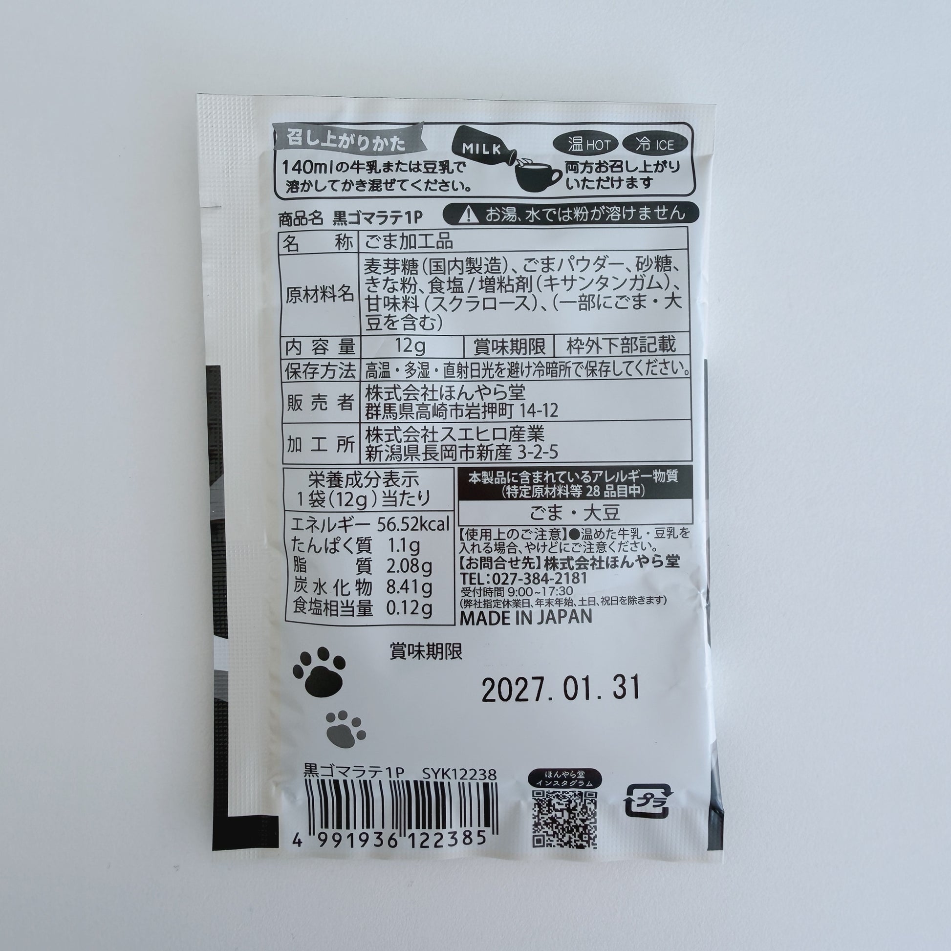 黒ゴマラテ:たんぱく質1.1g、脂質2.08g、炭水化物8.41g、食塩相当量0.12g(温冷両方可、牛乳や豆乳がおすすめ)