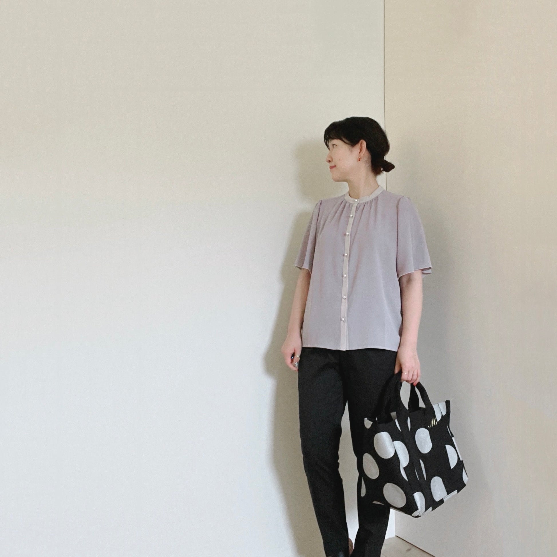 カプセリストさんは知ってるかも?な「ボタン全部違うブラウス」(いまは「ちょっとだけクラシカルなタックブラウス」)のメーカーさんなので、ボタンもあのボタンのひとつの丸いボタン♪
